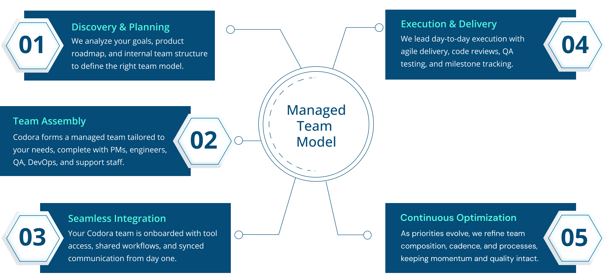 Your internal team focuses on vision and strategy while Codora handles day-to-day execution, communication, and delivery ownership.